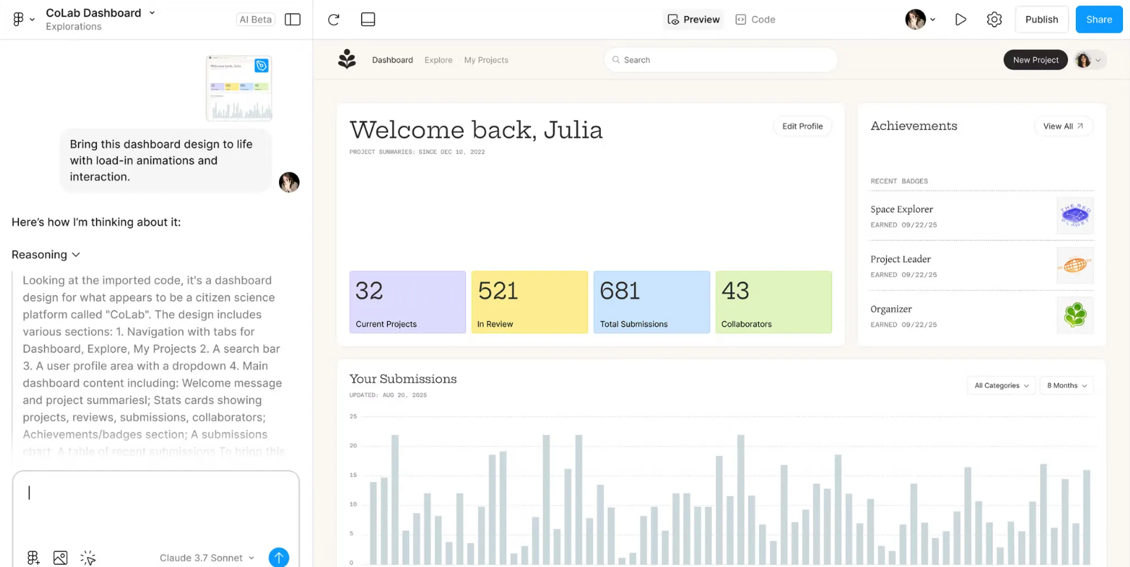 이 도구는 Figma에서 직접 디자인한 레이아웃을 AI 기반의 코드로 전환하여 빠르게 상호작용이 가능한 웹사이트로 만들어줘요.