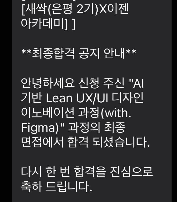 솔직히 면접을 보고 나서 '붙을까?' 하는 걱정이 좀 있었어요. 특별한 IT 경력이나 화려한 디자인 포트폴리오가 없었거든요. 그런데 며칠 뒤, 합격 문자를 받았을 때 정말 기뻤습니다! 아마 배우고자 하는 의지와 이 과정에 대한 간절함을 좋게 봐주신 것 같아요. 시설도 정말 깔끔하고 좋았는데, 이제 그곳에서 열심히 공부할 생각을 하니 벌써부터 설레네요. 앞으로 새싹에서 배우는 내용들도 꾸준히 블로그에 정리해서 공유해 드릴 예정이니 기대해주세요!