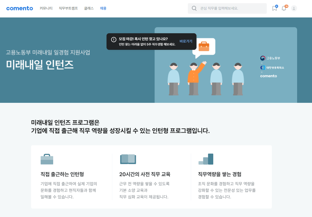 미래내일 일경험 지원사업은 고용노동부와 대한상공회의소, 그리고 코멘토가 함께 운영하는 인턴십 프로그램이에요. 단순히 온라인으로만 하는 체험형 인턴이 아니라, 기업에 직접 출근해서 실무를 경험하는 직무 체험형 인턴십이라는 점이 가장 큰 특징이에요!
