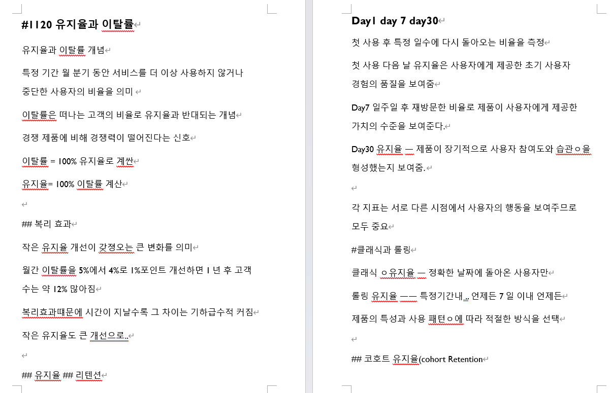 오늘은 유지율과 이탈률 그리고 퍼널에 대해서 학습했습니다. 유지율과 이탈률의 개념을 확실하게 알게 되었습니다. 다음은 복리효과에 대한 의미는 잘 몰랐는데 복리효과는 작은 유지율 개선이 가져오는 큰 변화를 의미한다고 합니다. 이 복리효과 때문에 시간이 지날수록 그 차이는 기하급수적으로 커진다고 합니다. 그렇다면 유지율 즉 리텐션이라고 불리는 이건 왜 이렇게 중요한지에 대해서 의문이 생겼지만 바로 다음 스텝에 해결이 되었습니다. DAY1, DAY7, DAY30을 기준으로 잡고 첫 사용 후 특정 일수에 다시 돌아오는 비율을 측정한다고 합니다. 첫날에 사용하고 다음날에 나오는 유지율은 사용자에게 제공한 초기 사용자가 경험의 품질을 보여준다고 합니다. 첫날에 사용해보고 괜찮으니 다시 돌아온거라고 생각하시면 됩니다. 그리고 7일차에는 재방문한 비율로 젶뭉이 사용자에게 제공한 가치의 수준을 보여준다고 합니다. 마지막으로 30일은 제품이 장기적으로 사용자 참여도와 습관을 형성했는지에 대한 지표를 알 수 있다고 하네요. 즉 서로 다른 지점에서 사용자의 행동을 보여주는 거라 모두다 중요하다고 할 수 있습니다.