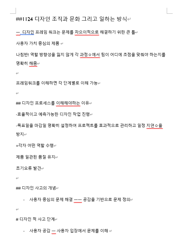 오늘은 디자인 조직의 이해와 디자인씽킹에 대해서 배웠어요. 디자인 조직에는 스타트업 대기업으로 나눠져있고 프레임워크를 활용해야된다고 합니다. 이 프레임워크로 사용자 가치 중심의 제품을 만들고 나침반 역할을해서 팀의 방향성을 잃지않고 명확하게 해줘야된다고 하네요. 이 프로세스를 이해해야하는 이유는 각자 어떤 역할을 수행할지, 목표설정을 통한 업무 효율화, 초기오류 발견, 제품의 일관된 품질 유지 등이 있습니다.