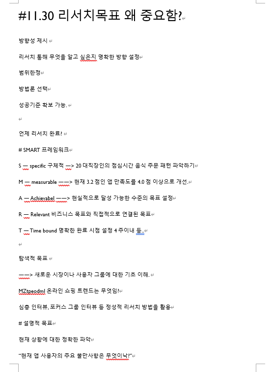 오늘은 리서치에 대해 배웠습니다. 리서치는 UIUX디자이너 준비하시는 분들이라면 많이 들어보셨을텐데 리서치를 하는 이유는 명확한 방향 설정을 위해 하는거라고 합니다. 말 그대로 방향성을 제시할 수 있고 범위한정, 방법론 선택, 성공기준 확보가 가능하다고 합니다. 리서치는 SMART 프레임워크를 사용하면 좋다고합니다. Specific, Measuarble, Achievable, Relevant, Time bound 이렇게 나눠진다고합니다. Specific은 구체적이라는 뜻인데 예시로 20대 직장인의 점심시간 음식 주문 패턴 파악하기로 들수 있고 measuarble은 현재 3.2점인 앱 만족도를 4.0이상으로 개선, Achievable은 현실적으로 달성 가능한 수준의 목표 설정, Relevant는 비즈니스 목표와 직접적으로 연결된 목표, Time bound는 명확한 완료 시점 설정(4주이내) 등으로 예시를 들어주셔서 이해가 훨씬 잘 되었습니다.
