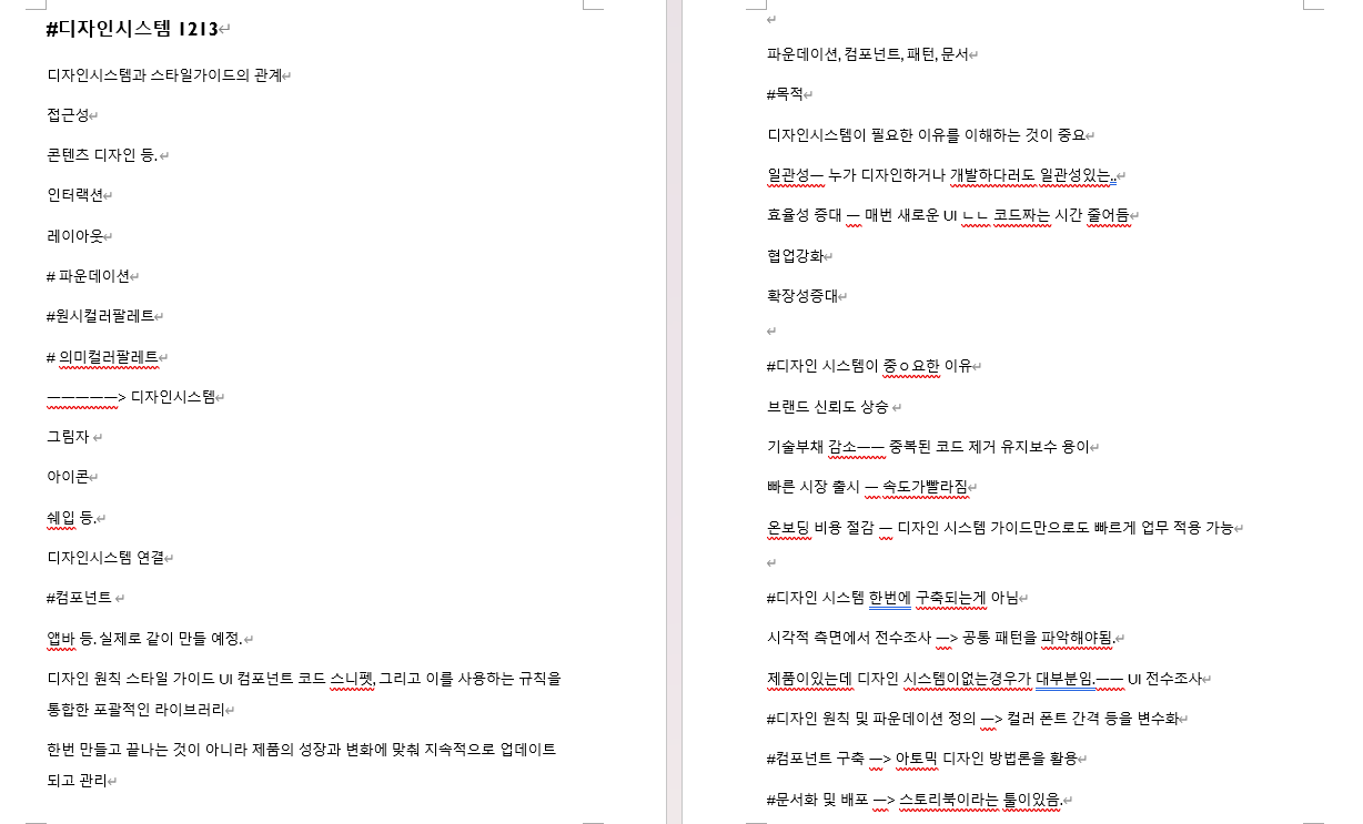 디자인시스템을 만들면서 체크해야 될 부분들이 있는데요. 브랜드 컬러, 그레이 스케일, 시스템 컬러, 투명도 등이 있다고합니다. 그리고 폰트 종류도 3가지가 넘어가는지 스타일은 같은 위계인데 크기나 굵기가 제각각인지, 가독성을 위한 줄 간격 규칙이 존재하는 지 확인해야 된다고 합니다. 또한, 페이지마다 마진과 컬럼 값이 일치하는지, 요소 사이의 간격이 4px,8px배수 없이 임의로 설정되어있는지, 아이콘은 라인 굵기, 스타일 크기가 일관적인지 등 체크해야될 부분이 굉장히 많네요. 이외에도 체크해야될 부분이 많은데 너무 방대해서 제가 주로 체크했던 점들위주로 작성했습니다.