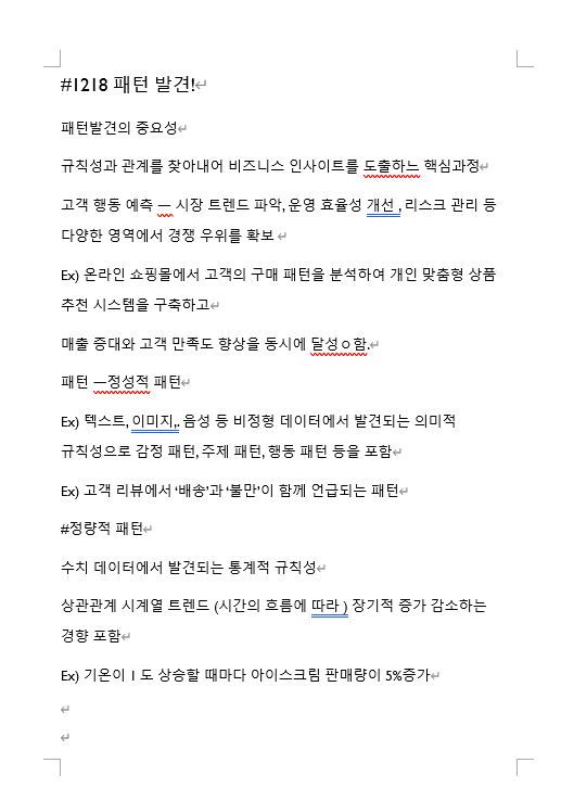 오늘은 패턴과 사용자 인사이트에 대해서 배웠습니다. 패턴은 막대한 데이터 속에서 규칙성이나 관계를 찾아내 비즈니스 인사이트를 도출하는 과정이라고 하네요. 패턴을 따로 리서치분석과정에서 필요한가 생각이 들었었는데 이런 것도 패턴이구나라는 예시를 많이 들어주셔서 이해가 되었습니다. 이 패턴을 통해 고객 행동 예측, 시장 트렌드 파악, 운영 효율성 개선 등 다양한 영역에서 경쟁 우위를 확보할 수 있다고합니다. 예시로 온라인 쇼핑몰에서 고객의 구매 패턴을 분석하여 개인 맞춤형 상품추천 시스템을 구축한다라고 들어주셨는데 쿠팡에서도 자주 사는 물품을 기반으로 유사한 물품을 추천해주더라구요. 저는 헤드셋을 사니 주변기기랑 헤드셋거치대를 추천해주더라고요. 그리고 패턴에서도 정성적 패턴과 정량적 패턴이 나뉜다는 점에서 신기했습니다.