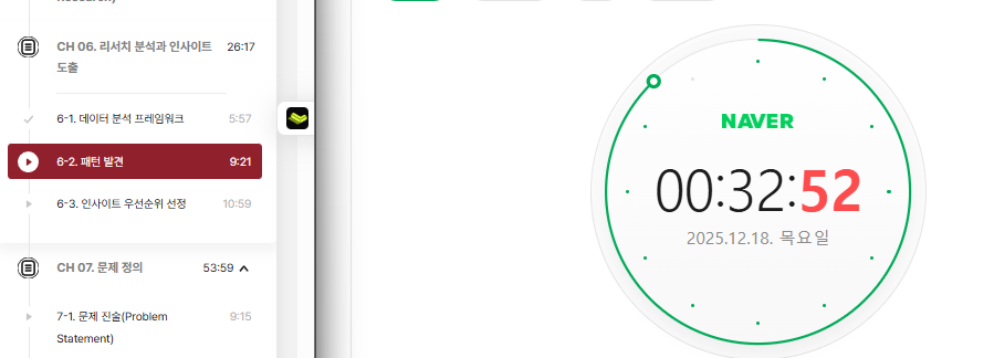 이후 패턴 발견 능력을 개발하는 방법에 대해 알려주셨는데 UT에서 히트맵 분석을 통해 웹페이지에서 사용자의 시선이 집중되는 영역을 파악하고, 중요한 정보나 버튼을 해당 위치에 배치하여 사용성을 개선하면 된다고 하셨습니다. 다음으로 행동 패턴분석 방법에 대해 알아보았는데요. 사용 빈도 패턴에서 특정 기능이나 페이지의 사용 빈도를 측정해서 선호도와 중요도를 파악한다고 합니다. 웹 로그 데이터도 활용하여 일별, 주별 월별 사용 패턴을 분석한다고 하네요. 확실히 저도 인턴 생활당시 로그데이터 흐름에 대한 정리와 기획을 했었는데 일별, 주별 월별 사용 패턴을 따로 분석을 해서 새롭게 제안해볼 수 도 있었을거같은데 지금 생각해보니 좀 아쉽네요. 다음은 시간대 패턴 분석 방법을 배웠는데 모바일 앱 푸시 알림 발송 최적 시간 결정으로 예시를 들어주셨어요. 제가 느끼기엔 인강사이트나 이커머스 같은 사이트에서 주로 시간대 패턴을 분석하여 특정 시간대마다 앱 푸시가 오는거 같았어요. 특별 할인쿠폰같은게 많이 오더라고요. 그리고 너무나 많은 분석방법들이 있어서 제가 몰랐던 방법 중에 전환 퍼널 패턴과 이탈 패턴 분석 등이 있어서 더 주의 깊게 봤었습니다. 전환 퍼널 패턴은 사용자가 최종목표(구매 등)에 도달하기까지의 각 단계별 전환율을 분석하여 병목 지점을 발견하는 방법이라고 합니다. 이탈 패턴 분석은 사용자가 서비스를 떠나는 지점과 이유를 분석하여 리텐션 전략을 수립한하는 방법이라고 하네요. 그리고 다른 패턴 분석방법으로 니즈와 동기 패턴 분석 방법이 있더라구요. 기능적 니즈와 감정적 니즈 패턴, 명시적 니즈와 잠재적 니즈 패턴 등 너무나도 다양한 패턴 분석 방법이 있었는데 이 중 상황에 맞는 패턴 분석방법을 활용하여 비즈니스 성과를 도출해보는 경험을 만들고 싶네요.