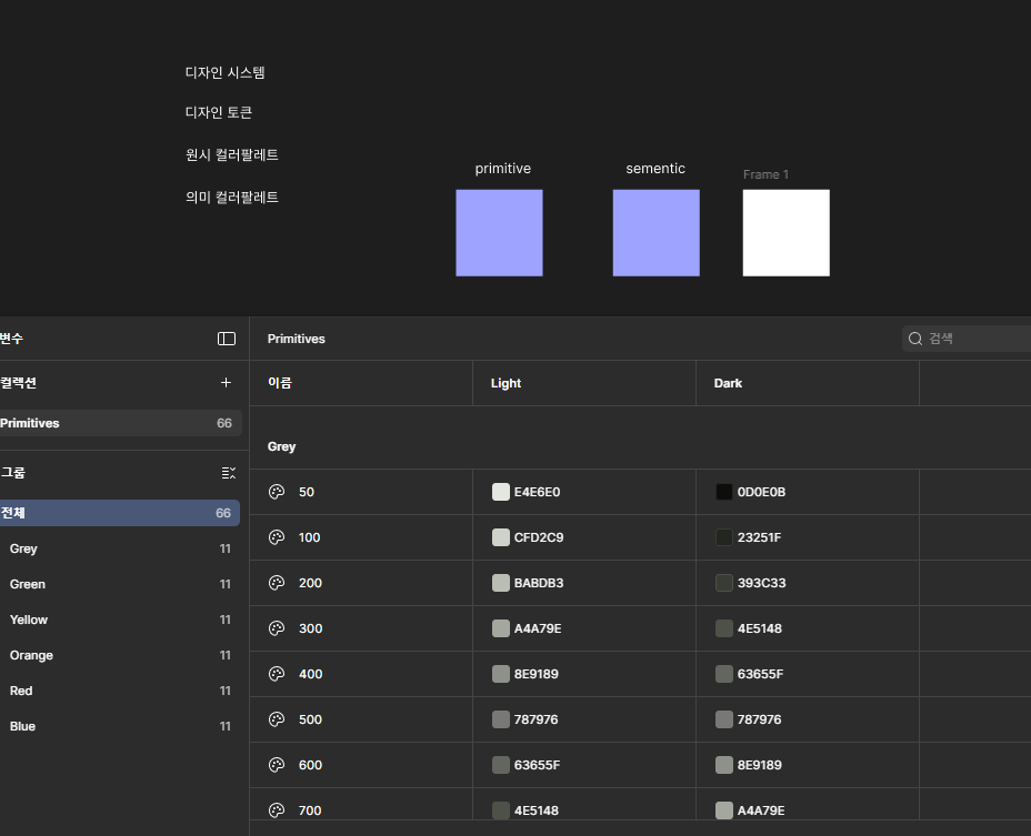 추가적으로 이 토큰은 아메리카노에 들어가는 실제 재료라고 생각하시면 됩니다. 즉 아메리카노를 레시피대로 만들어놨는데 만약 레시피가 바뀌면 수정이 필요하니 이 재료만 바꾸면 되는거니 편하겠죠. 그 이후 추가적으로 토큰을 만들고 베리어블에서 원시(Primitive)컬러 부분을 만들었습니다. 그리고 실제로 프로젝트를 하시다보면 UI디자인할때 색상이 한가지만 있는게 아니라 명도값별로 50~900이런 식으로 많이 사용하셨을 겁니다. 이 토큰값을 넣는 작업을 했지만 확실히 AI가 도래하면서 이걸 일일이 넣지않고 AI를 활용하여 넣거나 plugin으로 쉽게 베리어블안에 다 넣어주더라고요. 정말 2024년때 처음 접했지만 그때는 하나하나 토큰값을 지정하여서 넣었었고 다크모드도 기존에 있던 컬러를 다크모드에 맞게 변형시키는 것도 어려웠었습니다. 시대의 흐름이 정말 빠르게 바뀌어가고 있는게 다시 한번 체감되네요.