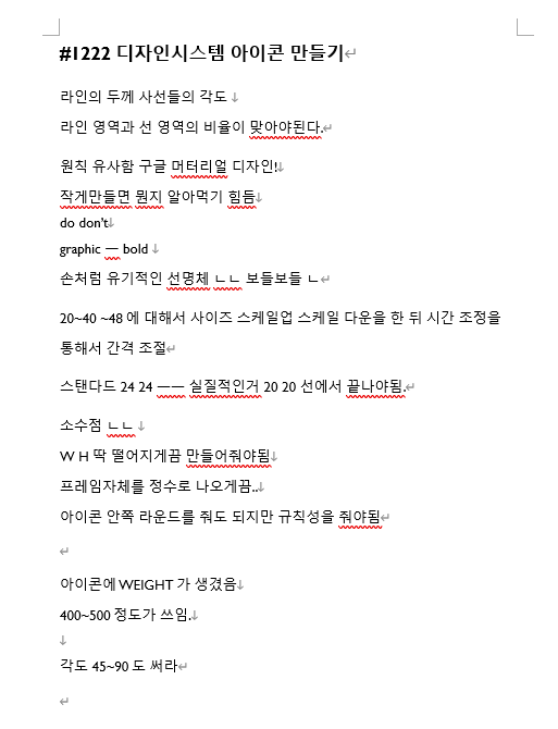 오늘은 디자인시스템에서 아이콘 만들기와 쉐잎만들기를 했습니다. 구글 머터리얼 디자인시스템을 보며 do와 don't를 비교해가며 아이콘에 대해서 배웠는데요. 아이콘은 단순해야하고 라인의 두께와 각도 그리고 라인 영역과 선 영역의 비율이 맞아야된다고 합니다. 또한 Standard icon size가 있는데 24dp로 쓰인다고 합니다. 그리고 소수점 이 부분이 정말 중요한데 프레임, 간격, Width, heingt 등 전부 딱 떨어지는 정수로 나와야된다고 합니다. 개발 시 오류가 생길 수 있기 때문이라고 하네요. 그리고 아이콘에 새롭게 Weight가 생겼다고 하는데 400~500 정도의 값으로 쓰인다고 하네요. 또한 Grade라는 부분도 배웠는데 앞에서 언급한 Weight랑은 또 다르다고 하네요. 다크모드가 대부분 서비스에 있는데 라이트모드에서 다크모드로 변환 시 아이콘 면적이 더 두겁게 보인다고해서 시각정 보정을 통해 얇게 만들어주는 거라고 합니다. 이걸 각각 만들긴 어렵고 플러그인을 활용한다고 하네요.
