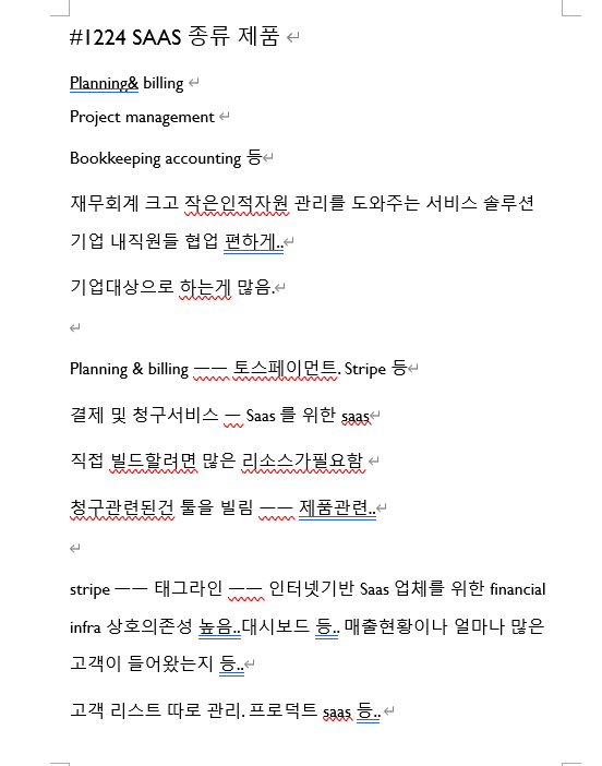 오늘은 SAAS 종류와 제품 그리고 주요지표에 대해서 배웠습니다. 저는 SaaS 종류 즉 어떤 툴들이 있었는지 잘 몰랐는데 이번 강의를 통해서 다양한 SaaS툴을 둘러볼 수 있어서 좋았습니다. SaaS는 Planning & billing, Project management, bookkeeping accounting, CRM 등의 여러 종류가 있다고 합니다. 먼저 planning & billing부터 보면 토스페이먼츠와 stripe 등이 있다고 하네요. 이런 서비스는 결제 및 청구 서비스인데 Saas를 위한 Saas입니다. 이 강의에서 직접 서비스에 들어가 어떤 기능들이 있고 어디에쓰이는지 탐색했어서 이해가 잘 되었습니다. 이 서비스를 쓰는 이유가 직접 빌드하려면 많은 자원들이 필요한데 대부분 청구 관련된건 툴을 빌린다고 하네요. 그래서 이러한 툴에서 어떤식으로 과금이되는지, billing menu, 주요지표,MRR 등을 한 눈에 볼 수 있다고 하네요. 다음은 Chargebee도 탐색했었는데 태그메뉴에서부터 SaaS를 목적으로 한게 느껴져서 신기했습니다. SaaS에 대해서 개념으로만 익혔지 직접 탐색해보진 안았는데 강의에서 랜딩페이지부터 기능까지 훑어서 보여주니 더 새롭게 다가왔습니다.