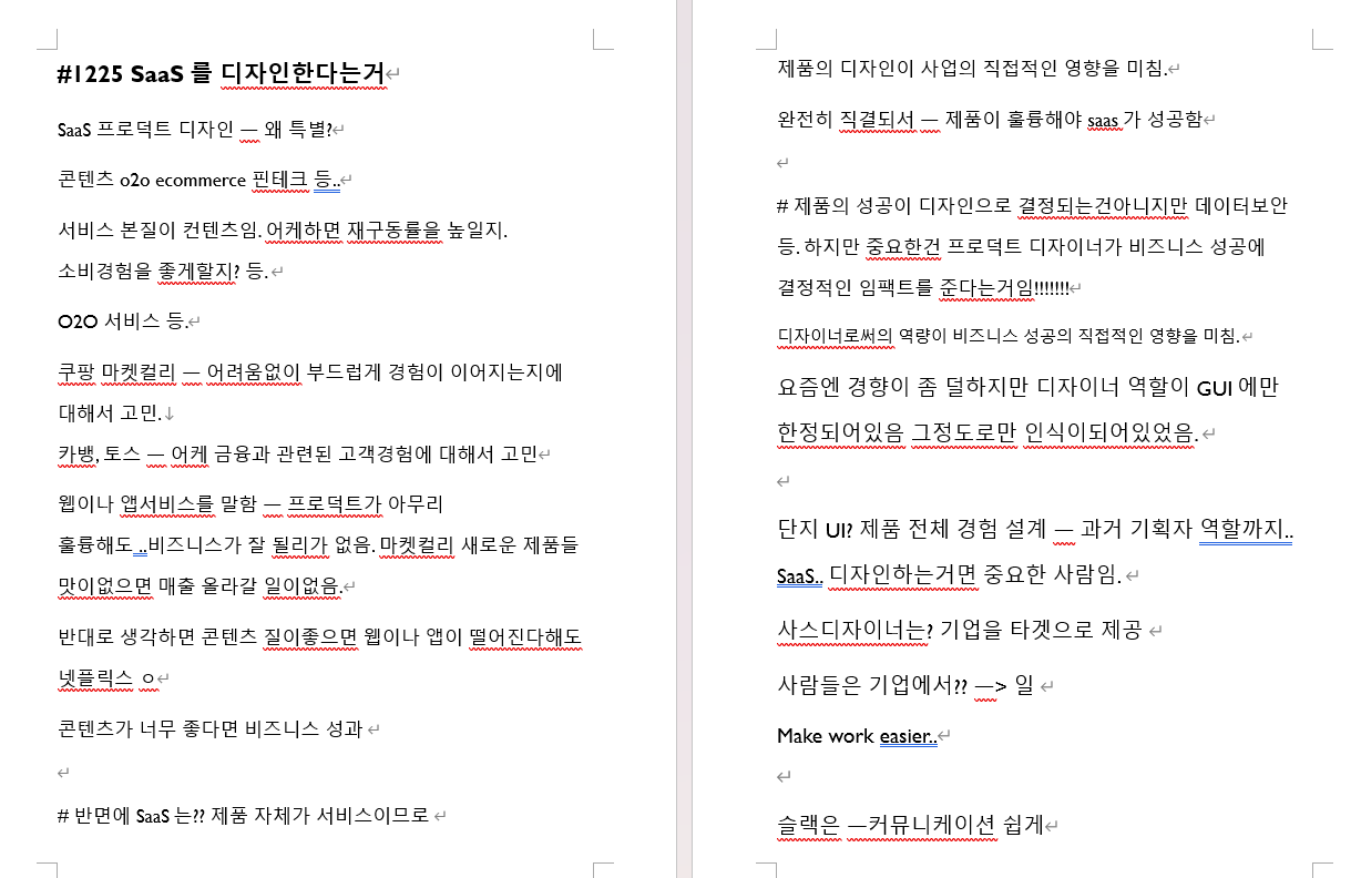 오늘은 Saas 프로덕트 디자인한다는 것에 대해 배웠습니다. 세상엔 정말 많은 종류의 서비스가 있는데 o2o, 이커머스, 핀테크, 등이있을 겁니다. 이커머스는 남의 제품을 팔고 부드럽게 구매까지의 경험이 이어지는 것에 대해서 고민하고 핀테크는 금융과 관련된 고객경험에 대해서 고민합니다. 그리고 예시로 이커머스나 콘텐츠 서비스는 아무리 훌륭해도 실제 판매되는 상품의 질이나 콘텐츠의 재미가 없으면 성공하기 어렵습니다. 하지만 SaaS는 제품 그 자체가 비즈니스의 본질입니다. 이 점에서 SaaS가 굉장히 매력적이라고 이야기 해주셨는데 이 말을 듣고 현재 저도 산업군을 고민하는 시기인데 매력적인 이야기로 다가왔습니다. 그 이후 더 집중하여 듣게 되었는데요. 이 SaaS 제품의 경험이 곧 고객의 업무 생산성으로 이어지고 곧 비즈니스 성과와 직결됩니다. 그래서 이제 프로덕트디자이너는 단순히 GUI화면만 만드는 걸 넘어 비즈니스 성공을 견인하는 핵심 설계자로서의 역할을 수행해야 하는 직업이라고 합니다.