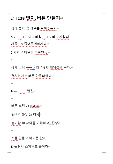 이번에 버튼을 만들어보면서 이렇게나 많은 property값을 넣어야되는지 몰랐고 개발자분들에게 전달할 때도 이런걸 정리를 하지않고 상태값만 componet로 만들어서 전달했었는데 확실히 꼼꼼하게 적용하여 드리면 더 편할거 같다는 걸 체감했습니다. 정리가 중요하다는 걸 깨달았고 매번 컴포넌트 적용 후 정리를 섹션별로 묶질않아서 가독성이 좀 낮았었는데 정리하는 방식도 배워갈 수 있어서 좋았습니다. 기초가 중요하다는 걸 알게되었고 사이드 프로젝트나 실무에서는 빠른 기간내에 요구하는게 많다고 생각하여 property 적용하는 것과 정리하는 것을 많이 시도해봐야 될 것 같습니다.